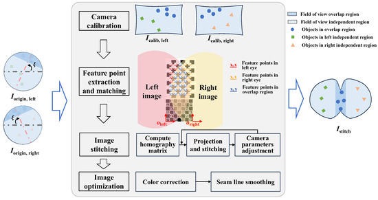 The image stitching method can merge binocular images to obtain a continuous and complete image, effectively avoiding ambiguity in processing left and right images. However, the fish-like vision system has the characteristics of large distortion and large disparity, posing certain challenges to the stitching of left and right fields of view. This section proposes a binocular visual field stitching method for a fish-like vision system with large disparity and distortion, and the process is illustrated in Figure 5.