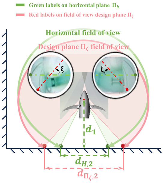 As large a field of view as possible: In underwater scenarios, a large field of view is beneficial for robots to capture more information, and reducing the blind spots of the binocular vision system is expected to enhance the efficiency of autonomous tasks such as underwater searching and inspection. The discussion on the field of view design is focused on the field of view design plane, as shown by the plane in Figure 2. On the design plane , the overlapping projected area of the two fisheye cameras is maximized, and the angle of overlap on this plane is defined as . When the field of view angle of the fisheye camera is , the range of the field of view can be represented as . Therefore, the condition for maximizing the field of view is expressed as follows: