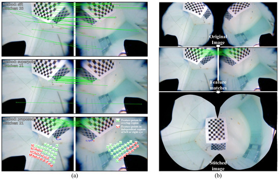 An underwater scene is set up, the angle of the robotic fish is adjusted, and images are captured with markers filling the overlapping area to obtain original images . After calibrating the original images using OCamCalib v3.0, feature matching methods are performed on the calibrated images . Figure 8a shows the results of left and right eye feature matching using the SIFT, SuperPoint, and proposed marker-assisted feature-enhanced matching methods.
