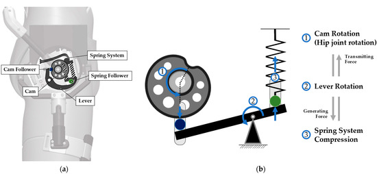 The components of the CVGC-II system are shown in Figure 2a. CVGC-II system majorly consists of a cam, lever, and spring system [27], and each component interacts through the cam follower and spring follower. Figure 2b illustrates the geometric relationship and relative movement between each component. The torque output axis, connected to the upper body module, is connected to the cam. Thus, the movement of upper body is converted to cam rotation. When the cam rotates, the lever which is contacted to the cam also rotates. The lever movement results in the displacement of the spring system. The reaction force induced by the spring displacement generates a normal force on the cam surface. Because the contact angle at the cam surface is not zero, the surface normal force generates an assistive torque along the cam axis.