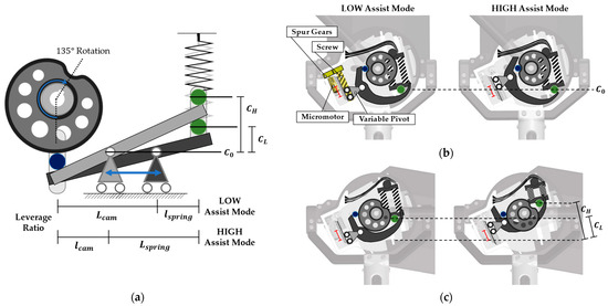Figure 3a shows the change in the leverage ratio and spring system displacement between LOW and HIGH assist modes through pivot position adjustment. The leverage ratio in the LOW assist mode is determined as follows: