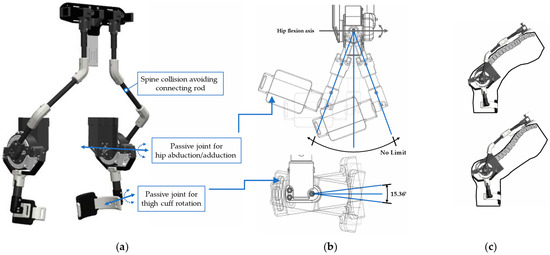 Similarly, a thigh rotation joint also can be a way to ensure free motion. The thigh cuff of the robot should be attached securely and comfortably to the leg because it acts as a support fixture when delivering assistive torque to the hip joint. To make secure and comfortable attachment, it must be able to flexibly adapt to various thigh thickness and tapered lines that change accordingly. Thus, we added a thigh rotation joint to ensure that the thigh cuff could rotate to adapt to the tapered line of the thigh and thus be in close contact with the thigh. The working mechanism and range-of-motion of the thigh rotation joint are illustrated in Figure 4b.
