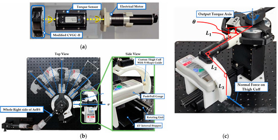 (a) Test bench setups for measuring the torque profile of modified CVGC-II, the assistive torque source module of AeBS. The rotary torque sensor was used to measure the torque profile of modified CVGC-II, and the electrical motor was used to rotate the modified CVGC-II torque output axis; (b) test bench setup for measuring the torque profile through the robot structure. The whole right side of the robot was attached, and the normal force on the thigh cuff was measured in 15 degrees intervals; (c) geometry of the robot structure to calculate the assistive torque from the normal force on the thigh cuff.