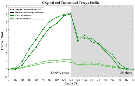 Measured original and transmitted assistive torque profiles in LOW and HIGH assist modes. “Original” refers to the torque profile of the modified CVGC-II system. “Transmitted” refers to the torque profile of the modified CVGC-II system transmitted through the robot structure.