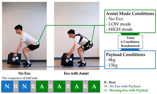 A questionnaire was used to evaluate the usability of the AeBS, including its variable assist function. The experimental protocol was approved by the Chung-Ang University Institutional Review Board (approval number 1041078-202107-HR-214-01C), and all procedures were conducted in accordance with the approved study protocol. Seven male participants (age: years, height: cm, and weight: kg) answered to the questionnaire after completing material lifting/lowering tasks in a squat posture. The sequence of the task with six conditions is shown in Figure 7, including two payload weight options and three assistive torque options based on exoskeleton-wearing dependency. The three assistive torque options were No Exo (not wearing exoskeleton), LOW (wearing exoskeleton with LOW assist mode), and HIGH (wearing exoskeleton with HIGH assist mode). The two assist modes were selected under consideration of practical usage. The LOW assist mode provides the lowest assistive torque, which can be used in lightweight material lifting/lowering tasks. In contrast, the HIGH mode provides the highest assistive torque, which can be used with heavy material lifting/lowering tasks. The two payload options were 8 kg and 13 kg, including the box. The task conditions were randomized to imitate a complex working environment and eliminate the order effect. However, the No Exo condition was conducted first to facilitate a comparison of the results in the presence and absence of the exoskeleton. The participants were allowed to rest for about 5 min between each task condition, and they selected the pace of lifting/lowering based on their comfort. In a single condition of the experimental task, the participants performed 13 repetitions of lifting/lowering tasks.