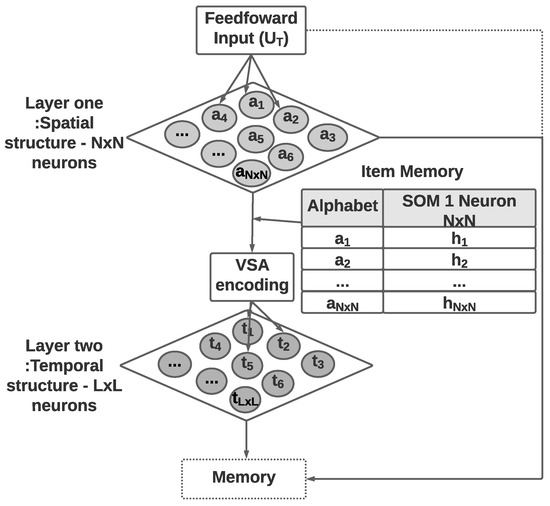 Before moving on to the second layer SOM, there is VSA encoding based on the first layer SOM Best Matching Units (BMUs), which are represented in steps 4 and 5 of the algorithm. Here, the function is used to give abstract sequences where each element is represented by BMU of the first layer SOM (), and the function is used to convert each sequence into an HD representation according to Equation (2).