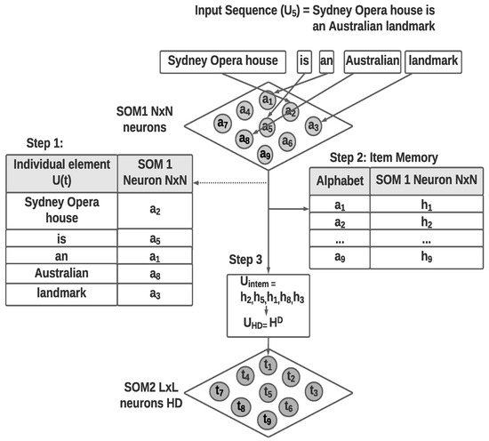 Figure 2 shows the sample hyper-dimensional encoding of the text sequence considering the sentence “Sydney Opera House is an Australian landmark”. The first step of separating the sentence into words and the identification of word embedding is not depicted in the figure. Individual words are considered as in this example and passed to the first layer SOM to position the individual words as a spatial or invariant representation. Due to the neighborhood preserving topological mapping property of the SOM, each word will be positioned among words with similar meanings or context from the inputs received.