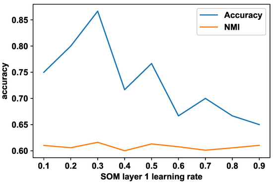 The first SOM layer uses the 14 feature vector values to generate a self-organized map representing the images. This self-organized structure provides an abstract grouping of the human body movement from the images based on the 2D poses, which represent the spatial elements (or the spatial alphabet). The optimal learning rate for the SOM is identified empirically. Figure 3 shows the cluster accuracy of the final temporal cluster results with the first SOM layer learning rate and normalized mutual information (NMI). According to Figure 3, the highest accuracy is achieved with a learning rate of 0.3. For this experiment, the number of iterations has been kept at 100.