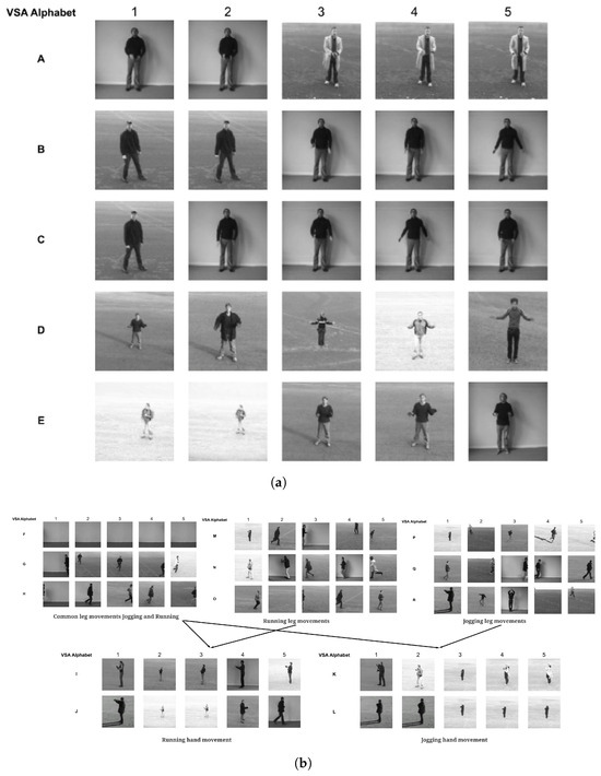To demonstrate the representational learning of spatial clusters by the first SOM, which is considered as the alphabet of elements with which sequences are made up, three separate sequences (videos) representing hand-clapping, jogging, and running classes are compared with the first SOM layer. Figure 4 shows a selected sample of the first layer SOM clusters (nodes), which represent elements of the identified alphabet and the first five representative images for each element from each cluster. The elements (clusters of poses) are labeled as A to L to represent the elements captured by the first SOM. For example, Figure 4a shows fove spatial elements made up of different poses from the sequence of hand clapping, captured and represented in the first SOM. The sample for each alphabet element selected (columns 1–5) shows that the same pose (alphabet element) by different individuals and in different conditions such as lighting is grouped in the same alphabet element. It can also be seen that elements (or alphabet) making up hand-clapping are fully separated from jogging and running. Jogging and running are shown to have a significant overlap of elements, which can be intuitively understood since these two activities can have much in common in terms of movement. In further analysis of the alphabet elements, it can be seen that sequences of jogging and running have similar leg movements, which results in the overlap in elements while differing in hand movements. This is reflected in the element (cluster) overlap; both jogging and running have F, empty image elements, and G and H running image elements as overlapping. This output can be further interpreted by observing the second SOM feature map for the related sequences in Figure 5, where hand-clapping sequences are positioned further away from the jogging and running sequences. This experiment demonstrates how the first SOM layer automatically captures the spatial elements of the data with which the sequences in the second layer are made up, therefore generating an alphabet of building blocks of the sequences.
