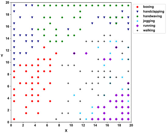 Next, HD vectors are created according to Equation (2) for the video trajectory. The second self-organizing layer clusters the videos, and Figure 5 shows the SOM 2D map of the KTH dataset. According to the 2D SOM map of the second SOM layer, hand movement activities (boxing, hand-clapping, and hand-waving) and activities with the movement of legs (jogging, running, and walking) have clearly separated into two regions, with individual activities further separating within the main regions.