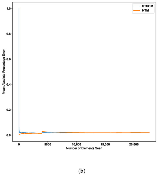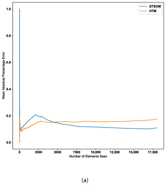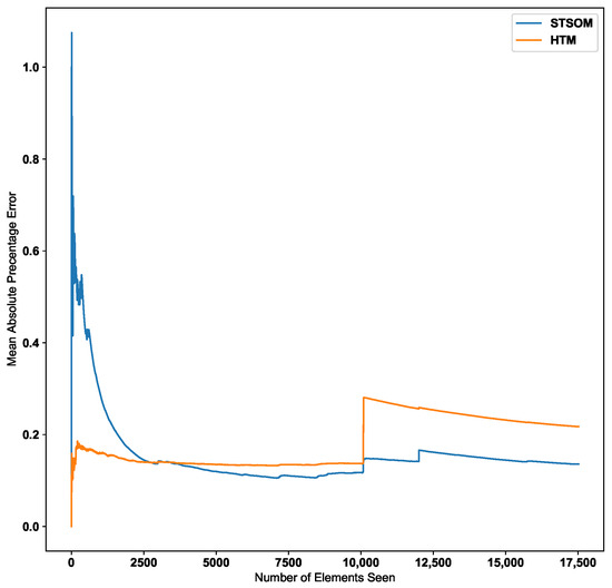 As per the graph for the Taxi passenger demand data in Figure 9, there is a noticeable increase in error around the 10,000 inputs data point. This point corresponds to a concept drift in the data stream resulting from a significant change in input values. The Spatio-Temporal SOM algorithm recovers from this concept drift with a minor increase in the error compared to HTM.