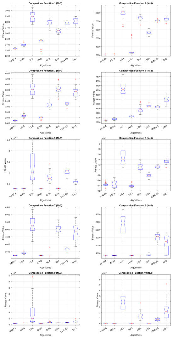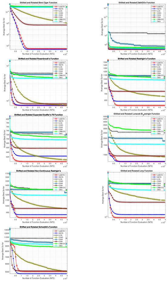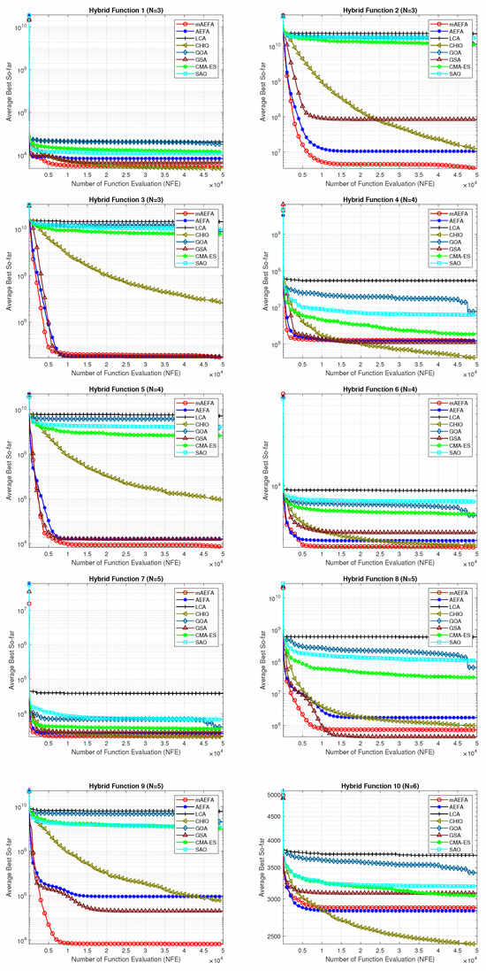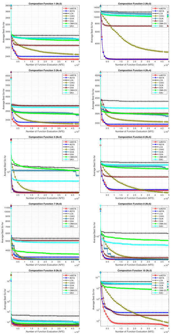 - In solving composite CEC’17 benchmark functions, mAEFA shows superior performance compared to other algorithms under comparison, except for specific functions. In unimodal, multimodal, and composite CEC’17 functions, mAEFA is either superior, equal, or ranked second among compared algorithms, with faster convergence observed;
