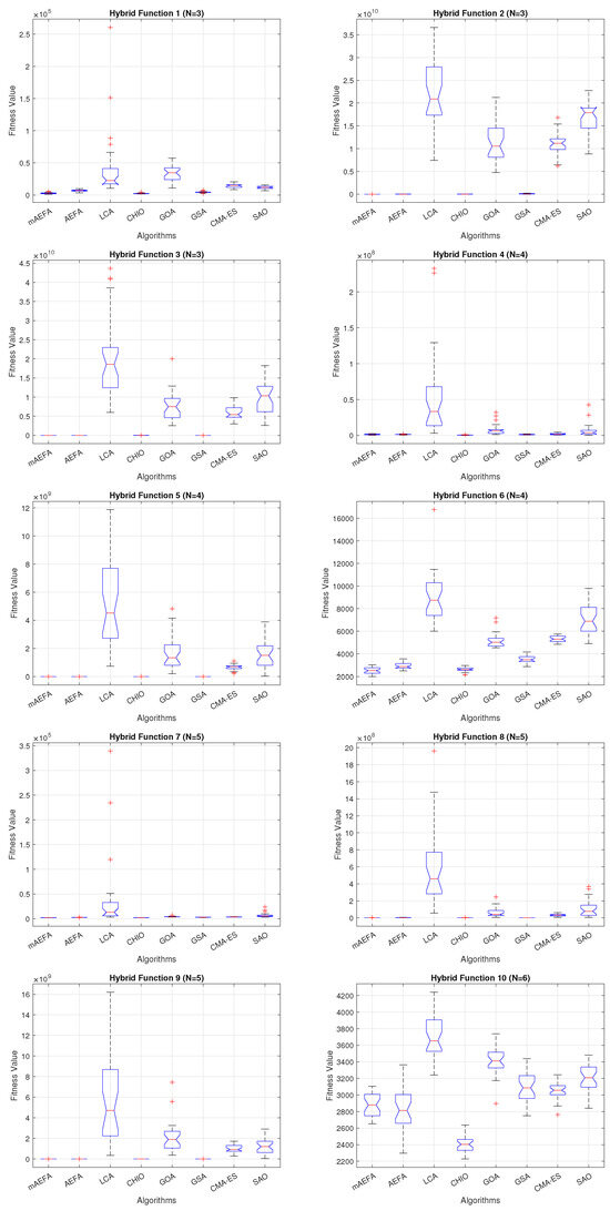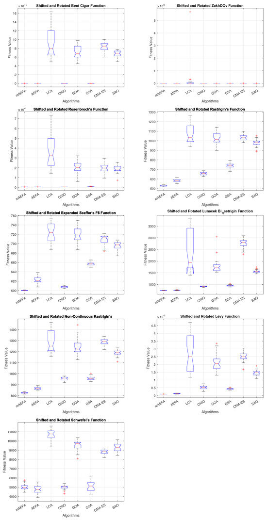 Additionally, Figure 5, Figure 6 and Figure 7 shows box plots for the proposed algorithm and the other compared algorithms, highlighting the distribution of results and the degree of proximity and similarity across multiple runs. The box plot is utilized to represent the minimum, maximum, and mean values for each algorithm. Box plots serve as an effective visual representation for presenting the performance values obtained in the 1st, 2nd, and 3rd] quarters of the experiment. A horizontal line within the box denotes the median value, while the whiskers extending outside indicate the variability beyond the upper and lower quartiles. Ideally, smaller box sizes and lower variability are preferred. Figure 5, Figure 6 and Figure 7 illustrate box plots for mAEFA for the majority of the functions, displaying narrow boxes with the lowest median and variability.