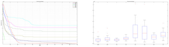 The convergence behavior of the proposed mAEFA algorithm, along with the other compared algorithms, applied to the CEC’17 functions is depicted in Figure 2, Figure 3 and Figure 4. It can be observed that mAEFA demonstrates rapid convergence for F3–F6, F8, F11–F14, F16, F17, F19, F21, F23, F24, and F27–30 compared to the classical AEFA algorithm. Additionally, mAEFA on average depicted better convergence behavior relative to the other algorithms in most of the CEC test suite benchmarks. The mAEFA algorithm demonstrates a balanced exploration–exploitation trade-off, evident in its convergence plots, showcasing both faster convergence and the discovery of optimal solutions during the search process.