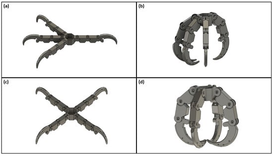 Figure 3. 3D representation of an ideal grasp for both claws using the motion study analysis: (a) anisodactyl open claw; (b) anisodactyl closed claw; (c) zygodactyl open claw; (d) zygodactyl closed claw.