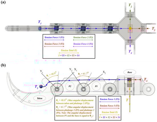 During the digit assembly process, both target phalanges are aligned to ensure their joints overlap. A torsion spring is secured between each joint to supply torsion force, and a finger post is inserted into the central overlapping hole to connect the two parts. The use of a finger post and torsion spring allows the digit to mimic the movement of a pin joint, which allows each phalange to rotate about a central axis while being restricted to one degree of freedom. A 0.61 mm stainless steel cable was used to mimic the tendons of the bird claw. Creating a four-bar linkage by connecting the actuator to the talon with the intermediate phalanges in between allows the digit to curl without interference [37]. Figure 5a displays the junction point that comprises the four-bar linkage where all four digit cables meet together. Once threaded through the digit, each cable was crimped at the distal portion of the talon as well as the main cable in the bird claw base. The cables threaded through each of the 4 digits were crimped together with the main cable, which was then coiled around a spool attached to a MG996R servo motor. The main cable serves as the central connection point for the four-digit cables at the base, ensuring consistent contraction of each digit. The main cable was fed through the base and secured to the spool at the top of the claw housing, controlled by the servo motor, which rotates to actuate the digits. To create a grasping motion, the servo motor winds in a clockwise motion, reeling the cable in to curl the digit inward. To release the grasp, the servo rotates counterclockwise to relax the wound cables, and the torsion springs return the claw to its starting position. Figure 5b highlights the maximum angular displacement of each digit component during actuation. Maximum angular displacement represents how far each digit component can rotate before parts of their body begin to interfere with one another. The talon and the second phalange are capable of rotating 48.0 degrees relative to one another before a component of the talon begins to contact the face of the second phalange. These exact values were determined with the same motion analysis study used to analyze the ideal actuation of the fully assembled claw. These values reflect the ideal actuation of a singular digit. The angular displacements are significantly reduced during a grasp due to interference caused by other digits.