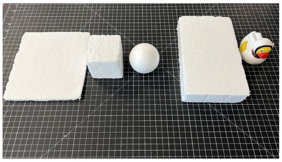 Figure 7. Objects used in qualitative assessment, from left to right: thin (220 mm × 135.5 mm × 48.5 mm), cubic (75.0 mm × 75.0 mm × 75.0 mm), spherical (75.0 mm diameter), wide rectangular (225.0 mm × 135.5 mm × 48.5 mm), and irregular (Lmax 74.5 mm × Wmax 180.0 mm × Hmax 66.5 mm).