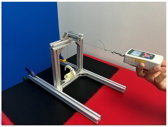 The single-digit flexion test, informed by the testing procedure carried out by Mio et al. [38], evaluated the load capacity for a single digit [38,39]. The digit extension test conducted by Mio et al. follows guidelines outlined by the plastic testing standards ISO 178 and ASTM 790 [41,42]. The existing standards for prosthetic devices typically have the finger fully extended to apply a load at the most distal part of the digit, serving as a correlate for the pinch force capacity of a single finger [38,39]. The minimum load to meet this test’s requirement is 30N [38,39]. The test conducted on the biomimicry models was modified to start with the digit in a curled position. The deviation was minor, due to the geometric differences between the talon and prosthetic finger design. This modification was made since the developed bird-inspired models do not use pinching as the primary grasp method, whereas the original testing procedure was designed to measure the prosthesis’s pinch ability [38,40]. The force applied to the digit in a curled starting position was more similar to the type of force the digit would encounter when grasping an object. The single digit was mounted to the testing platform and secured as shown in Figure 8. The cabling running through the channels in the digit was pulled taut and crimped at the level of the base and talon to retain the digit in its curled position. An upward force was applied to the talon to represent the force encountered by a grasped object due to gravity. The loaded cable was looped over the t-slot bar at the top of the testing platform and pulled vertically. A handheld digital force gauge was used to simultaneously pull the cable and measure the force in newtons until the digit failed. Failure in this case was defined as the inability of the digit to retain its original position. The failure condition, defined as extreme digit displacement, caused the cable, finger posts, or 3D-printed plastic to break or deform.
