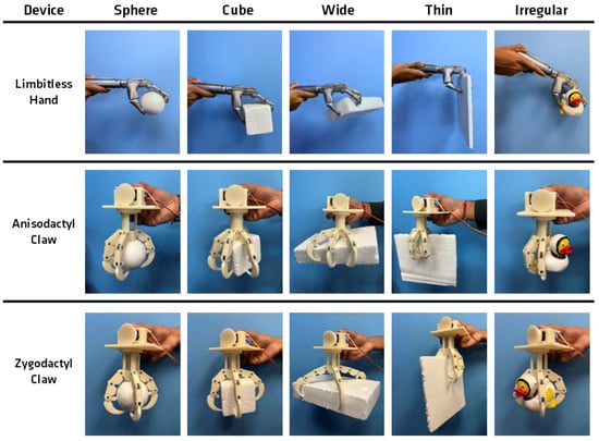 Figure 10. Qualitative grasp test results displaying the grasp interaction between each device and object type.