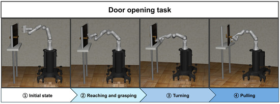 The door-opening task is one of the common benchmark tasks in the fields of robotics and automation. The environment for the door-opening task is designed around a scenario in which a robot manipulator interacts with a door handle to open the door. The goal of this task is to enable the robot manipulator to accurately grasp the door handle and successfully open the door. In this paper, the door-opening task is divided into the following four subtasks.