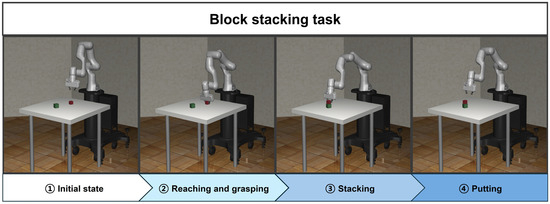 Block stacking is the task of stacking or loading blocks. It is a major task that can be used in various application fields such as manufacturing, logistics, and construction. The environment for the block-stacking task includes a scenario where the robot manipulator interacts with multiple blocks to stack them. The objective is for the robot manipulator to accurately manipulate and stack the blocks at the target position. In this research, the block-stacking task is divided into the following four subtasks.