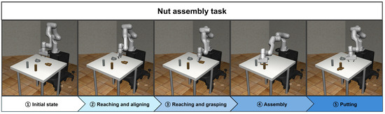 The nut assembly task is the main task for the mechanical automation of robot manipulators. The environment of the nut assembly task includes a robot manipulator, nuts, and pegs that the nuts are to be fitted onto. The goal of this task is for the robot manipulator to accurately grasp the nut, move it, and align it with the peg. Through the proposed methodology, nut assembly can be divided into six subtasks as follows: