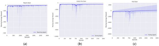 Trend in moving average reward during door-opening task across episodes: (a) reaching agent; (b) turning agent; (c) pulling agent.