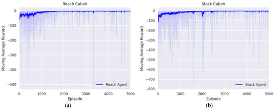 Holding the target block and reaching over the base block in the target position was the second objective of the block-stacking task. In this case, the initial state was set when the end effector reached and grasped the target block by the first agent and simple gripper manipulation. From the initial state, the agent was trained across 5000 episodes, each consisting of 300 steps, utilizing the same reward system as the first reaching agent to minimize the positional difference between the target position and the end effector. Figure 6b shows the moving average trend initially fluctuating before gradually stabilizing, through which we can see that the reward converges to zero. In addition, the episode was considered a success when the end effector grasped the target block and reached the target position above the base block. This criterion is represented as follows: