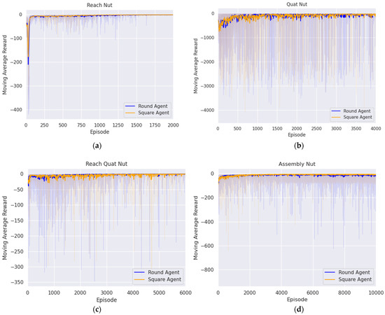 Trend in moving average reward during nut assembly task across episodes: (a) first reaching agent; (b) aligning agent; (c) second reaching agent; (d) assembly agent.