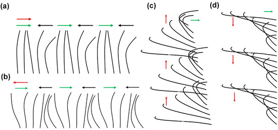 A noteworthy observation in the domain of biological cilia is the prevalence of metachronal motion, a phenomenon of coordinated wavelike movement of arrays of cilia. As explained earlier, there are four basic types of metachronal motion in nature, as illustrated in Figure 1. Morphologically, in symplectic metachrony shown in Figure 1a, the cilia performing the effective stroke are spaced more closely together than the ones performing the recovery stroke, while this is the other way around for antiplectic metachromism in Figure 1b. In dexioplectic and laeoplectic metachronism, shown in Figure 1c,d, respectively, the individual cilia have more freedom of movement than in symplectic and antiplectic metachronism [5,8].