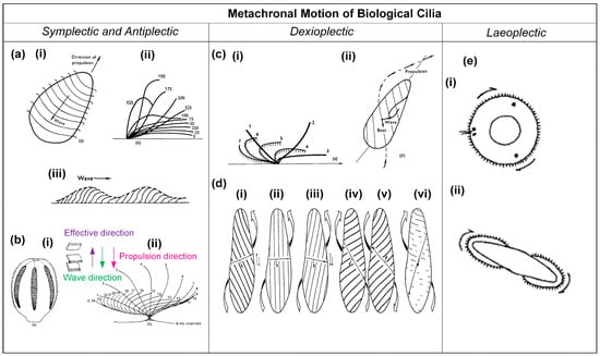 Laeoplectic metachronal motion has been identified in various organisms, including Chaetopterus, Mollusca, Bryozoa, and Ploima. Two examples are illustrated in Figure 2e [8]. Figure 2e(i) shows the larva of Bugula, while Figure 2e(ii) depicts the cyphonautes larva of a bryozoan [8]. Both figures show the apical view. The cilia are indicated at the circumference, and the arrows indicate the wave motion; the effective stroke of the cilia is directed into the plane of observation.