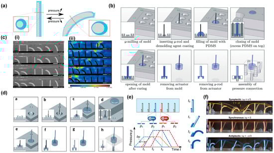 Pneumatic artificial cilia were first reported by Gorissen and coworkers [26]. These artificial cilia are flexible, hollow cylindrical tubes made of polydimethylsiloxane (PDMS) with an eccentric void, as shown in a cross-section in Figure 3a by the hatched area. If the void were concentric, as in the case of regular tubes, the flexible tube would solely expand in diameter when applying pressure [21,26,37,60]. However, the eccentricity of the void creates an asymmetric stiffness, which causes the cilia to bend when pressurized. Each cilium is connected to a pressure controller, meaning that every single cilium in a cilia array can be actuated independently [21]. The effective stroke of the cilia is defined as the movement from an upright to a bent state when being pressurized. The fabrication process of these cilia is shown in Figure 3b, where we can see that they can be produced by a high aspect ratio molding process. The cavity of the cilia is formed by a polished tungsten carbide microrod with a diameter of 0.61 mm placed in one half of the mold. The other half of the mold consists of a micro-drilled hole that defines the outer dimensions of the cilia (diameter of 1 mm and length of 8 mm). Alignment of both halves of the mold is achieved using locating pins, which are positioned accurately to define the eccentricity (0.14 mm) between the microrod and the drilled hole. After closing the mold, liquid PDMS is poured in and cured, and subsequent demolding finishes the production process. To achieve metachronal motion, the authors fabricated six pneumatic bending cilia positioned in line to form a ciliated surface and applied six fast switching solenoid valves to control the pressure applied to each cilia individually, allowing for imposing pressure waves with an arbitrary phase shift. The authors realized both antiplectic and symplectic metachronal motion by this method, as shown in Figure 3c, in which (i) shows the antiplectic metachronal motion with a phase difference of 45 degrees and (ii) shows the symplectic metachronal motion with a phase difference of 45 degrees as well.