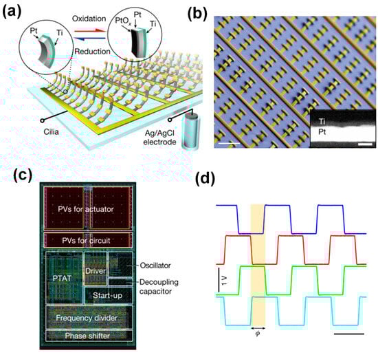 Later, Wang et al. [23] successfully engineered voltage-actuated cilia capable of generating non-reciprocal motion individually and metachronal motion collectively. These cilia have the shape of strips, measuring approximately 50 μm in length, 5 μm in width, and having a thickness of about 10 nm. They consist of a platinum (Pt) thin film with a thickness of 7 nm and are sealed on one side by a passive titanium (Ti) layer anchored to the substrate at one end, as illustrated in Figure 5a. A scanning electron microscope (SEM) image of an assembled artificial cilia array is presented in Figure 5b. The inset in Figure 5b is a scanning transmission electron microscope (STEM) image of a cilium cross-section showing platinum (white) and titanium (black). The artificial cilia are actuated in phosphate-buffered saline (PBS; 1×, pH 7.45) by raising their potential to about 1 V relative to a Ag/AgCl reference electrode, triggering electrochemical oxidation of the exposed Pt surface and resulting in surface expansion and consequent bending of the actuator (Figure 5a, red reaction pathway, left to right). Applying a voltage of approximately −0.2 V reduces the Pt film, which returns the actuator to its initial state (Figure 5a, blue reaction pathway, right to left). Furthermore, the researchers seamlessly integrated the cilia array with complementary CMOS-based microcircuits, enabling untethered control. This integration involved the fabrication of a photovoltaic-powered CMOS clock circuit, as shown in Figure 5c. These integrated components worked together to produce a sequence of phase-shifted voltage signals at a user-defined frequency when exposed to light, as shown in Figure 5d. This approach facilitated the realization of a metachronal wave pattern across the cilia array.