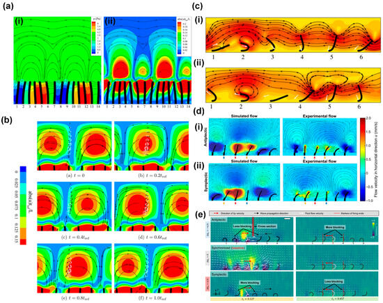 The analysis of Khaderi et al. [64] showed that metachrony alone can generate net flow, even in the absence of asymmetric motion of the cilia. However, most cilia in nature exhibit non-reciprocal motion. Therefore, researchers also investigated the effect of metachrony of non-reciprocally moving cilia on flow generation, both numerically and experimentally [16,21,63]. These studies found that antiplectic metachronal motion is more effective in enhancing flow generation by synchronous asymmetric cilia motion than symplectic metachronal motion. The common explanation for this effect given in most studies is based on the notion that cilia can have different shielding or obstruction effects on the fluid flow generated by adjacent cilia, depending on the type of metachrony. This can be illustrated by numerical simulation results from Khaderi et al. [63], who reported that antiplectic metachrony leads to a considerable enhancement in flow compared to symplectic metachrony, especially when the cilia spacing is small [62]. Figure 7c depicts the velocity field for both antiplectic (Figure 7c(i), wave traveling to the right) and symplectic (Figure 7c(ii), wave traveling to the left) metachrony at moments of maximum flux during simulations. In both images, the fifth cilium is at the peak of its effective stroke, towards the left. In the case of symplectic metachrony (ii), the flow created by the fifth cilium is obstructed by the close proximity of the fourth cilium, which has just initiated its effective stroke, resulting in the formation of a vortex. Conversely, in the case of antiplectic metachrony (i), the position of the fourth cilium allows unimpeded flow from the fifth cilium, resulting in a greater net fluid flow compared to its symplectic counterpart. Milana et al. [21] reported similar results based on experiments using pneumatically actuated artificial cilia and corresponding numerical simulations, shown in Figure 7d. For small-phase difference metachronal waves, they found that antiplectic coordination increases fluid flow velocity up to 50% compared to a synchronous beating mode, while symplectic metachrony decreases it. Like Khaderi et al. [63], Milana et al. [21] came to the conclusion that these effects are caused by an obstruction mechanism between cilia in the array that hinders effective flow generation in the case of symplectic waves. Also, Dong et al. [35] reported that only antiplectic metachronal waves with specific wave vectors could enhance fluid flows compared with the synchronized case, based both on experiments with magnetic artificial cilia and on simulations. Similar to the explanations given above, the authors proposed that the differences in fluid flow generation for the two metachrony types are due to differences in obstruction effects of fluid flow between adjacent cilia, as illustrated in Figure 7e for antiplectic, synchronized, and symplectic metachrony. Compared to synchronous motion, the cilia in an array with antiplectic metachrony have less blocked local fluid flow from their neighbors during the effective stroke, but more blocked local fluid flow during the recovery stroke; for symplectic metachrony, this is the other way around.