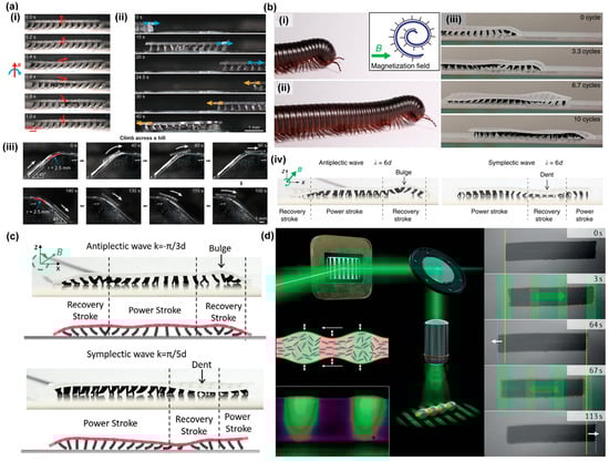 Zhang et al. [57] achieved metachronal motion of magnetic artificial cilia through the precise control of magnetic particle alignment in individual cilia within an array, driven by a uniform rotational magnetic field, as explained above and shown in Figure 6c. The same publication presents a walking microrobot with legs composed of magnetic cilia. The intricate interplay among frictional forces, adhesion forces, and magnetic forces, in combination with the resultant slight bending of the robot body, resulted in forward locomotion of the microrobot, as shown in Figure 9a(i). By simply reverting the rotation direction of the magnetic field, the robot could be made to walk in opposite directions, as shown in Figure 9a(ii). Furthermore, the researchers showcased the remarkable capability of robots to climb across hills, as depicted in Figure 9a(iii). The metachronal motion of the cilia turned out to be crucial for the locomotion: when the cilia moved synchronously, the microrobot did not show any net displacement. Gu et al. [58] also introduced a soft-walking robot with metachronal magnetic artificial cilia as legs, drawing inspiration from the locomotion patterns observed in the African millipede, as illustrated in Figure 9b(i–iii). Their investigation revealed a significant difference in locomotion speed between robots employing antiplectic wave patterns and those with symplectic waves, with the antiplectic wave being much more effective. The authors explained that this difference in speed could be attributed to the opposing curvatures of the substrate during the recovery stroke. As depicted in Figure 9b(iv), the robot body shows an indent at the location of the recovery stroke in the case of symplectic waves, impeding the movement of magnetic cilia due to increased surface friction; conversely, antiplectic soft robots experience bulging of the body at the recovery stroke location, facilitating unconstrained motion of the cilia. This observation sheds light on the mechanism underlying the locomotion of soft-walking robots, offering insights valuable for their design and optimization.