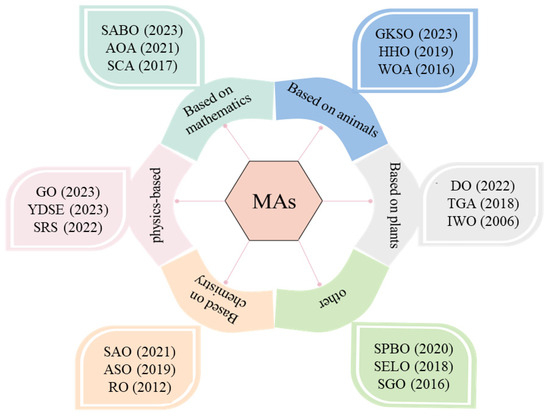 MAs are widely used and essential in science, technology, finance, and medicine. For example, in artificial intelligence (AI), MAs improve the model’s performance and accuracy [3]. It can also be used to optimize problems in AI applications such as intelligent recommendation systems, image processing, and natural language processing to provide better user experience and quality of service. In the financial field, MAs can be used to optimize investment portfolios and risk management to improve investment returns and reduce risks. In the medical field, the MAs can be used to optimize the allocation and scheduling of medical resources to optimize work efficiency in medical services. In transportation, MAs can be used to optimize traffic signal control and route planning to reduce traffic congestion and improve transportation efficiency [4] and so on. In addition, the application of MAs presents some opportunities for algorithmic improvement, multi-objective optimization, and integration with machine learning, but also some challenges, including high complexity, parameter selection, and local optimal solutions.