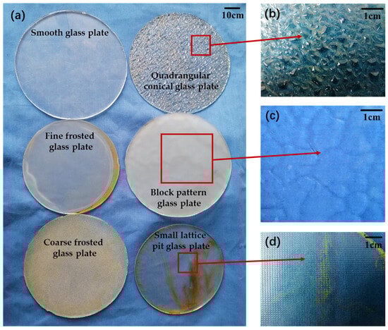 (a) The six force measuring plates used for the tensile test; (b) the quadrangular conical glass plate and the specific quadrangular conical morphology; (c) the block pattern glass plate and block pattern’s specific morphology; (d) the small lattice pit glass plate and the pit’s specific morphology.