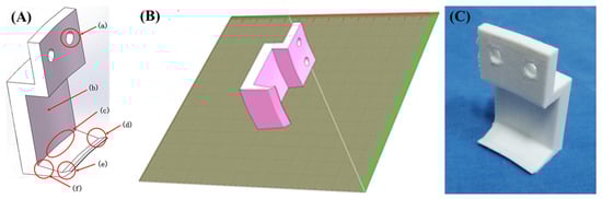 (A) Hook three-dimensional model and design details; (B) 3D-printing process of the hook; (C) 3D-printing hook entity.