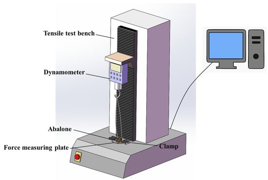 The universal testing machine (WSM-500N) used in the tensile test was controlled with a computer. Before the test, six force measuring plates were placed at the bottom of each leaching basin. Then, one abalone (purchased and kept in the aquarium, as shown in Section 2.1.1) was placed on each force measuring plate. Finally, the leaching basin was placed at the bottom of the aquarium together with the abalone samples on the force measuring plates, which were left to slowly adhere. In each test, the force measuring plate and abalone adhering to its surface were placed together on the testing machine for the tensile test. In this test, the force measuring plate was fixed first, and then the left and right sides of the abalone shell were hooked with two self-made hooks. Next, the tensile test was carried out. Figure 4 presents a schematic diagram of the tensile test. In this test, the lifting speed of the tensile testing machine was 100 mm/min. As the abalone became subjected to increasing upward tension, the abdominal foot was gradually separated from the force measuring plate. The test ended when the abalone’s abdominal foot was completely detached from the force measuring plate. Then, the maximum tensile force on the abalone during the whole tensile process was recorded and taken as the adhesion force of the abalone’s abdominal foot. The time interval between each tensile test was 24 h to ensure that the adhesion force of the abdominal foot did not increase with extended time. Five tests were performed for each force measuring plate.