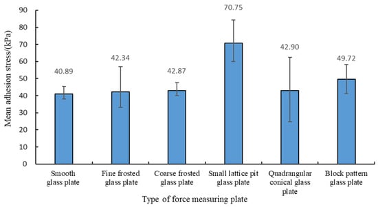 Figure 5 presents a box plot of the average adhesion stress (f) of the abalone’s abdominal foot on different force measuring plates. It can be seen from Figure 5 that the average values of adhesion stress (f) on the smooth glass plate, fine frosted glass plate, coarse frosted glass plate, and quadrangular conical glass plate were basically the same, whereas the stress value on the block pattern glass plate was slightly larger. The stress value on the small lattice pit glass plate was largest.