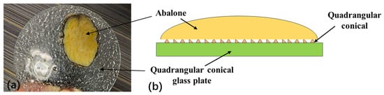 (a) The adhesion of the abalone’s abdominal foot to the block pattern glass plate; (b) The adhesion area of the abalone was larger than the area of the abdominal foot upon complete attachment to the morphological surface of the block pattern glass plate.