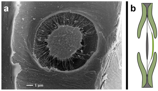 (a) Microscopic image of a bordered pit (with kind permission of Prof. Dr. Gerhard Wanner). (b) Drawing of an opened (grey) and closed (green) bordered pit (drawing by Anastasiya Mironava based on [15]).
