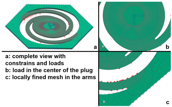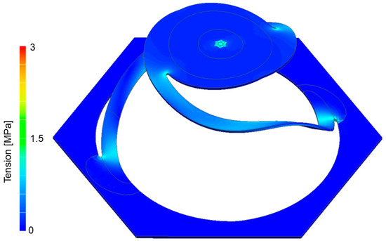 Upon deflection, the membrane experiences a multi-axial stress state consisting of bending and torsion. The deformations of these are added via superposition. In simplified terms, the spiral arms are assumed to be a clamped linear bending beam whose length can be determined by the function of the Archimedean spiral used. The torsion depends on the distance to the center of the plug, which can also be determined mathematically. The stresses occurring in the spiral arms of the membrane are very low due to their small thickness. The deformation is therefore in an approximately linear elastic range (Figure 11).
