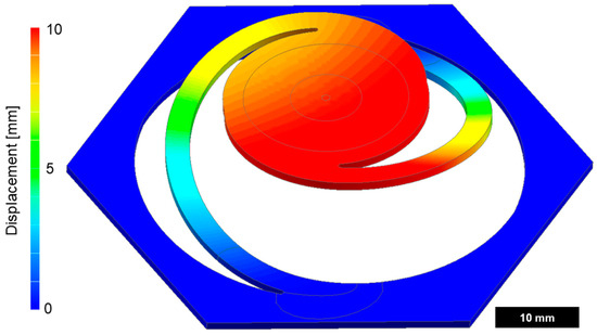 A stress analysis was performed on the structure. Under the extreme displacement of the torus plate of 20 mm (instead of the 8 mm design displacement), weaknesses of the design and breakpoints became visible. In the simulation (Figure 9), the stress was rather uniformly distributed, with moderate peak stress at the end points of the spiral arms, both at the base and the torus plate insertion.