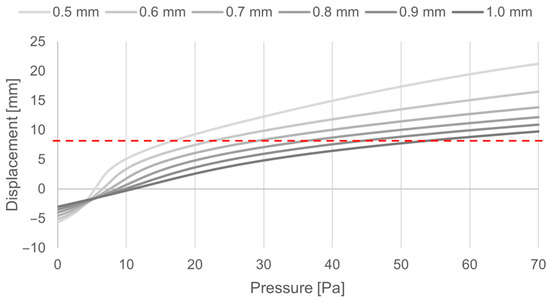 In the chosen application case, a pressure of 70 Pa was derived as the desired closing pressure as this would equal roughly 30 km/h, a critical transition where aerodynamics become increasingly important in fuel efficiency. At a given displacement, the closing threshold can be achieved at different pressures by adjusting the membrane thickness (Figure 8).