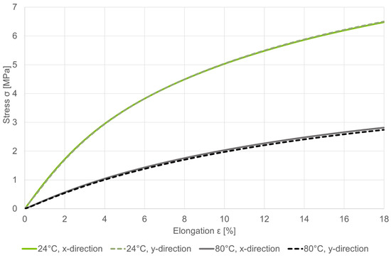 Stress–strain behavior of Z-Semiflex prototype material testing following DIN ISO 527-2. [21] Test specimen (type 1B) printed in massive material. Loading occurred at 100 mm/min; n = 6 experiments per direction.