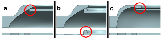 The first verification tests showed incomplete closure of the valve caused by surface roughness and stiffness of the membrane (Figure 12a). Therefore, firstly, the counter-structure received a tiny circular thickening (Figure 12b,c) such that the membrane came to rest and a complete closure was achieved. Secondly, the membrane was fitted with a tiny circular thickening (Figure 12b), which aided in the reliable axial positioning and hence the closure of the valve. Both changes were verified in the setup. The airstream was now fully blocked (Video S1). In terms of manufacturing, a combination of (b) and (c) appear most feasible, as the flexible—and here completely flat—structure can simply be punched from roll material. Additionally, the lower mass aids in valve responsiveness.