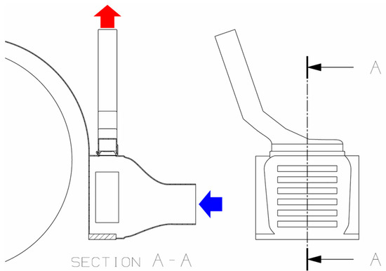 Abstract design of chimney effect adjusted to the wheel arch cooler setup. Air flow with open valves is indicated by red and blue arrows. The chimney shape is a result of geometric constraints given in the application case [25], [adapted].