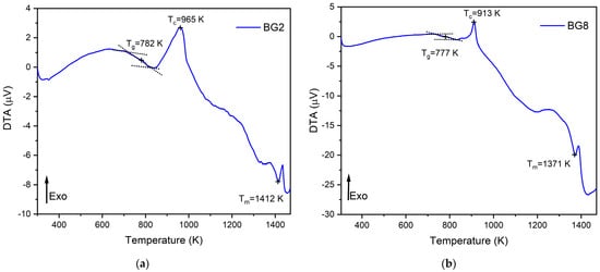 DTA spectra of (a) BG2 and (b) BG8 samples.