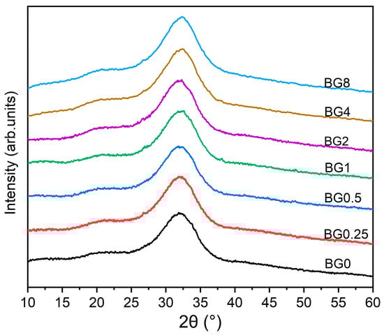 Both base and modified bioglasses had been synthesized based on the composition of 45S5 (45% SiO2, 24.5% Na2O, 24.5% CaO, and 6% P2O5 (wt%)) proposed by Larry L. Hench []. The bioactive glass composition of 45S5 was studied by the introduction of various concentrations of copper, CuO, from 0 to 8 mol% (designed by BG0, BG0.5, …, BG8). In the synthesis of bioglasses, high-purity grade (>99%) SiO2, P2O5, CaCO3, Na2CO3, and CuO, supplied by Sigma-Aldrich, Darmstadt, Germany, were used as the starting compositions. These materials were mixed and homogenized in an agate vessel with milling agate balls for 1 h at 300 rpm, using a high-energy planetary ball milling system []. The mixture was then calcinated for 8 h at 800 °C and, afterward, was melted in platinum crucibles that were placed in an electric furnace at 1300 °C for 1 h. The homogeneity was ensured by repeated hand mixing of the melt. Effective cooling was achieved by quenching the molten glasses after removal from the furnace in between casting plates to obtain bulk samples.